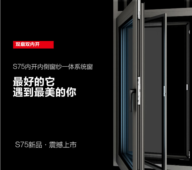 特色:双扇双内开;规范撞角注胶工艺;纱窗多功效化;纱窗装置避免误操纵嵌入式锁孔;埋没式排水体系