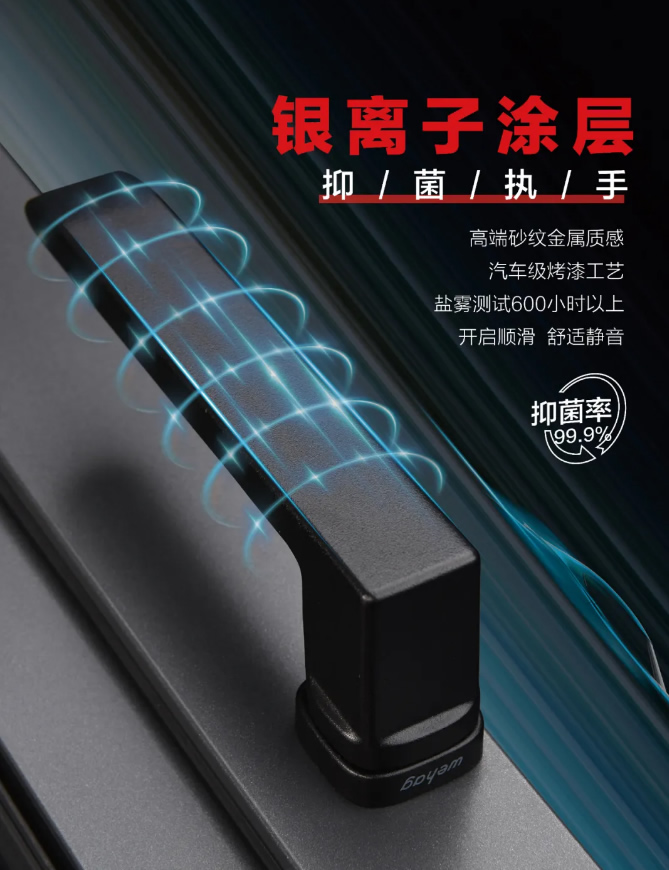 银离子涂层,抑/菌执/手。高端砂纹金属质感,汽车级烤漆工艺,盐雾测试600小时以上。